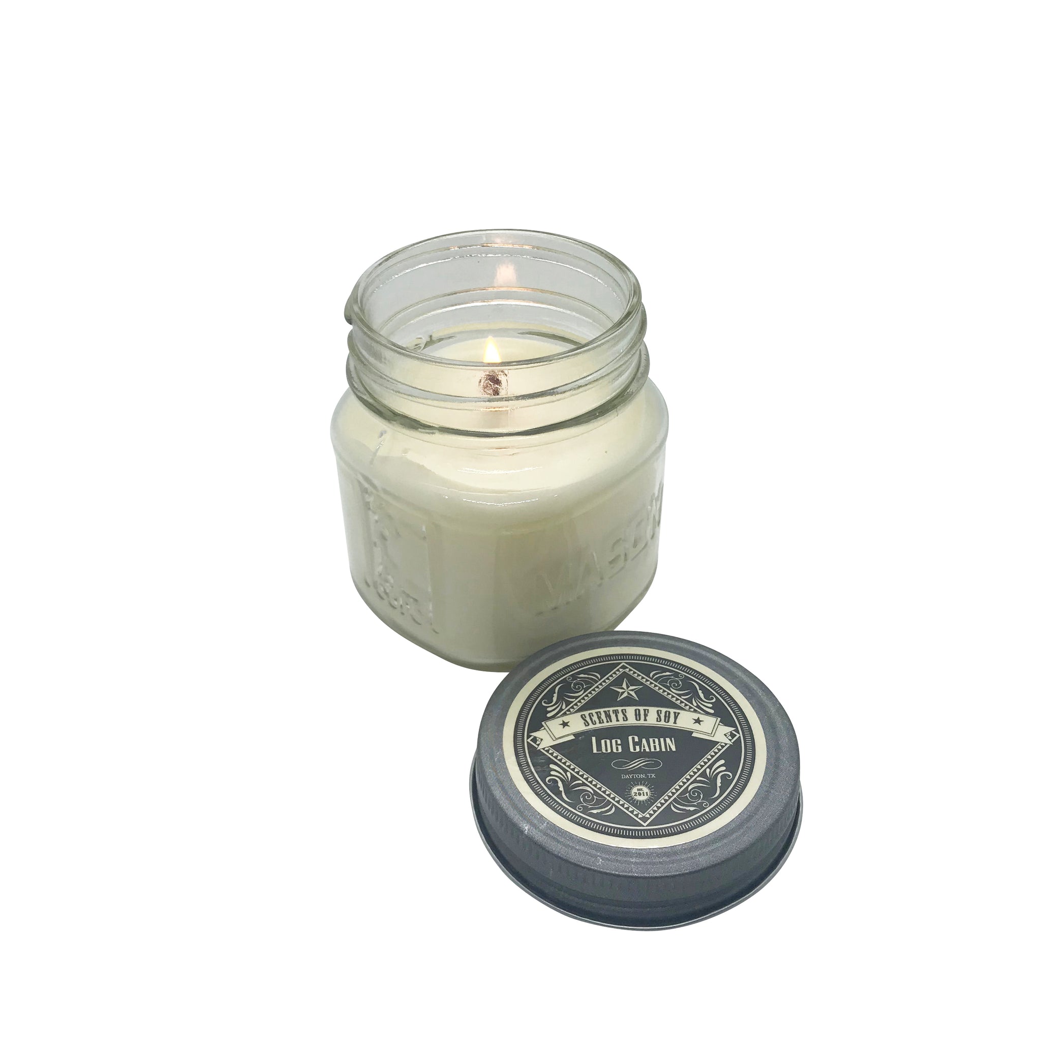 Glass embossed container with galvanized rustic lid with black and cream label.